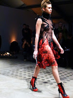 one evening dress had a a crocodile effect created by diamond shaped organza pieces). Some pieces were adorned with clear Lucite long bubbles, a suggestion of jewelry with an inspiration in sculpture. Colors went from far ends of the color spectrum, from light blush pinks, to rich, saturated emerald greens and
